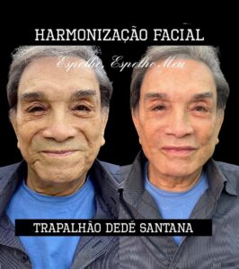 Dedé Santana surpreendeu os fãs nas redes sociais ao mostrar o resultado de um procedimento de rejuvenescimento facial aos 86 anos. Em uma plataforma de fotos, o ator e comediante compartilhou o antes e depois de uma harmonização do rosto e deixou os admiradores chocados com a diferença. O artista fez preenchimento na mandíbula, bigode chinês, mento, olheiras, malar e lábios. O ex-integrante do grupo humorístico Os Trapalhões também foi submetido a técnicas de design de sobrancelha.