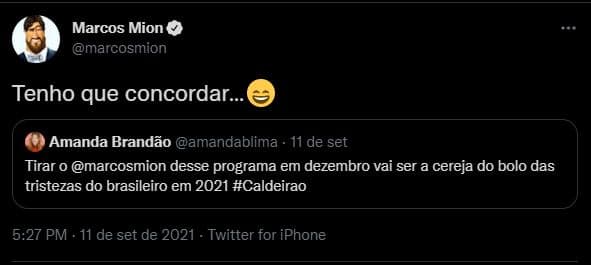 Sem rechaçar abertamente uma possível ida para o Big Brother Brasil, Mion não tem escondido de seus admiradores que almeja sua manutenção como apresentador do Caldeirão. No final de semana, ele admitiu durante uma live que só está garantido na atração até o último programa deste ano, mas que gostaria de seguir no formato em 2022. Em outra rede social, ele compartilhou a publicação de uma fã que afirmava que a sua saída do comando da atração seria “a cereja do bolo das tristezas do brasileiro em 2021”. “Tenho que concordar”, pontuou o apresentador.