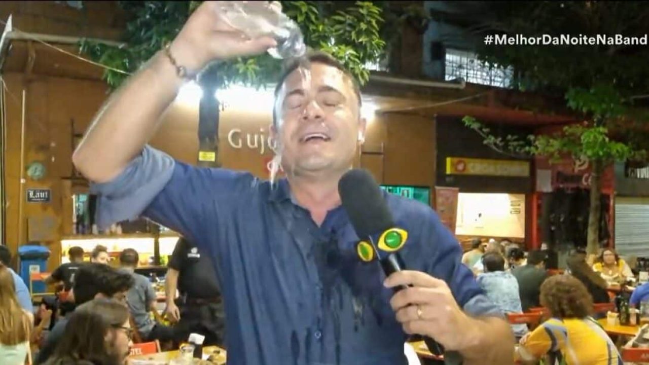 Ao encerrar a matéria, Wagner de Oliveira se despediu de Zeca Camargo e Glenda Kozlowski, mas antes tomou um banho com a garrafinha de água que tinha em mãos. “Já fui convidado para tomar uma cerveja, mas não vou poder beber. Posso fazer isso para me refrescar um pouco? Lavar a alma!”, disse ele, que virou a garrafa de água.