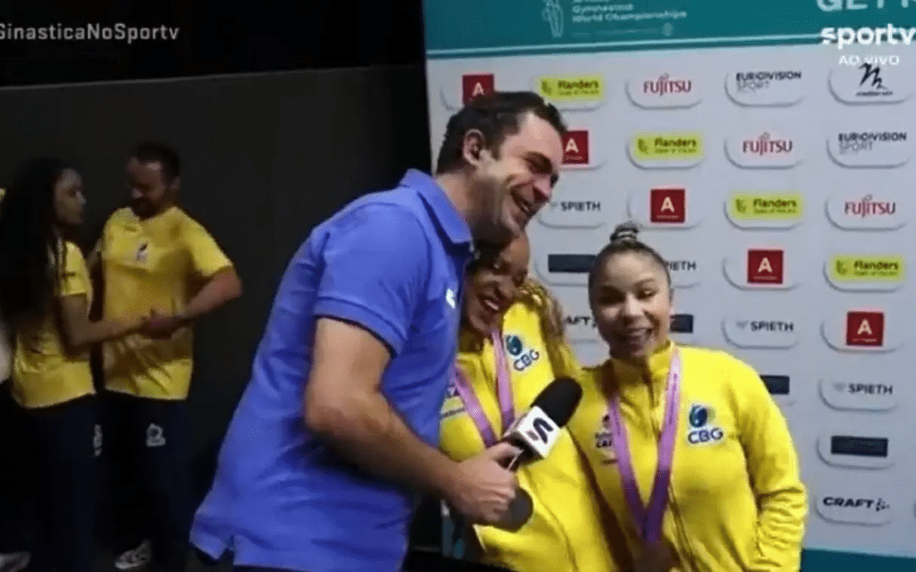 “Parabéns, vocês são exemplos do nosso país”, completou o repórter, sendo consolado pelas ginastas: “Não chora não”, disse Rebeca ao jornalista, enquanto Flavinha brincou, afirmando que ele poderia chorar. “Chora, pode chorar”, disse ela. A dupla conquistou medalha de prata e bronze respectivamente no solo do Mundial de Ginástica, já a de ouro ficou com a americana Simone Biles.