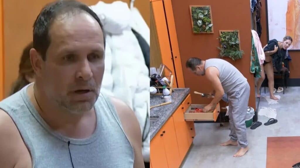 O ex-Polegar reclamou com alguns integrantes de A Grande Conquista que sua cama estava molhada por causa de uma cueca. “Molharam minha cama com sunga molhada em cima da minha cama. Aí é sacanagem”, disparou. Ele pegou o objeto e jogou em Fábio, que estava deitado no chão. “Porr*, filho da put*. Tô com dor nas costas. Eu tô passando mal aqui, respeita”, berrou o cantor.