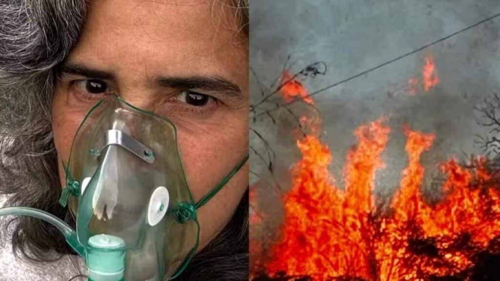Foto de Lúcia Veríssimo e de incêndio em fazenda
