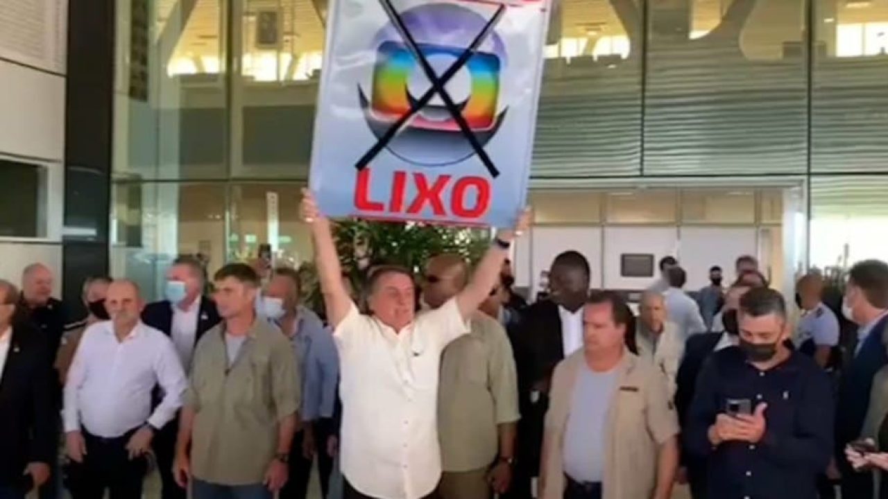 Jair Bolsonaro continua em sua saga pública contra a TV Globo. O presidente aproveitou um evento no aeroporto de Cascavel, no Paraná, nesta quinta-feira (4) para protestar publicamente contra a emissora, levantando um cartaz com a logo da empresa riscada por um grande X e o termo “Globo lixo” estampado em letras vermelhas garrafais.