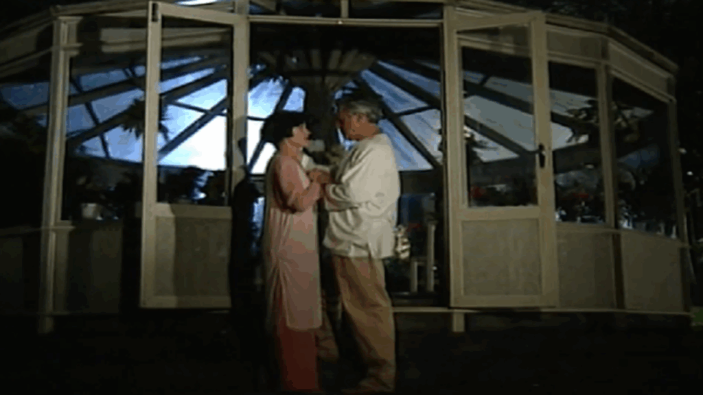 Diná e Otávio conversam em frente a estufa iluminada à noite em cena A Viagem