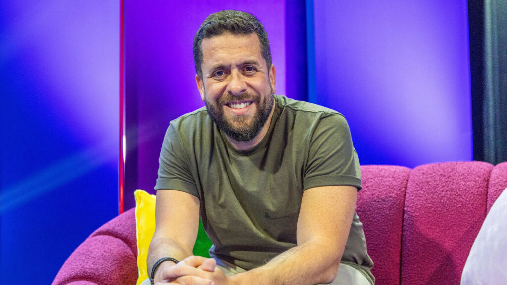 Maurício Meirelles sorrindo, de barba, sentado em um sofá rosa texturizado com fundo roxo neon no cenário do Aberto ao Público da Globo