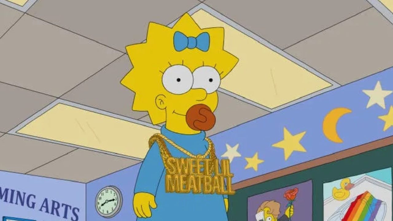 Personagem animada Maggie Simpson, bebê da série Os Simpsons, aparece em pé usando vestido azul, laço no cabelo e chupeta na boca, com um colar dourado grande escrito “Sweet N’ Meatball”, em um ambiente interno que parece uma sala de aula infantil, decorada com estrelas, lua e desenhos nas paredes.