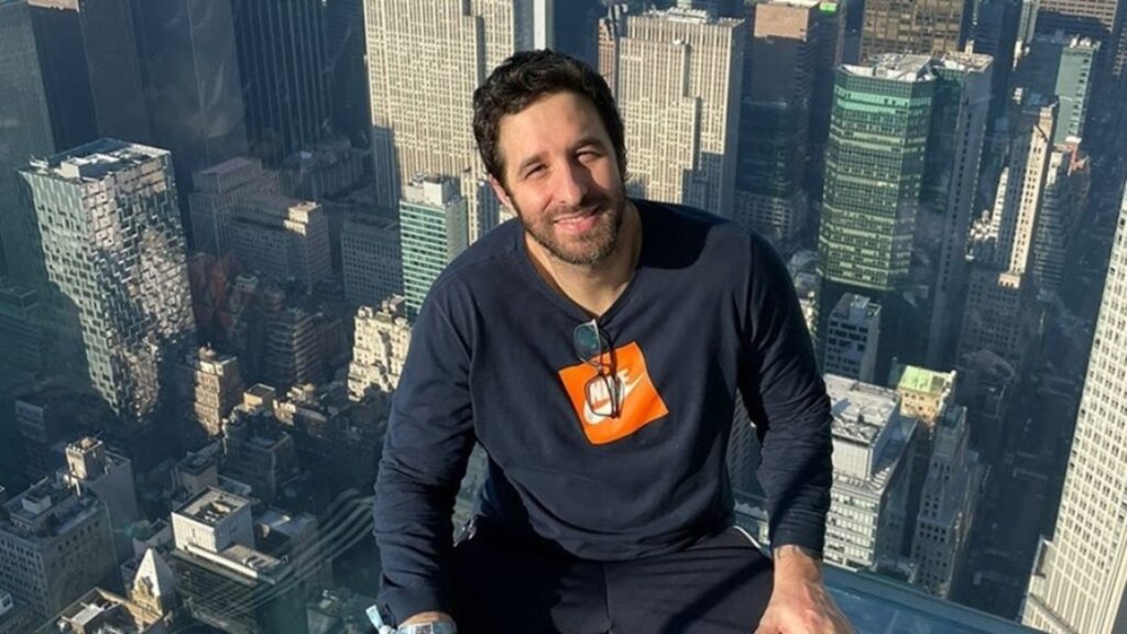 Homem de barba e blusa azul marinho com logotipo alaranjado posa sorrindo em mirante com vista panorâmica de arranha-céus ao fundo