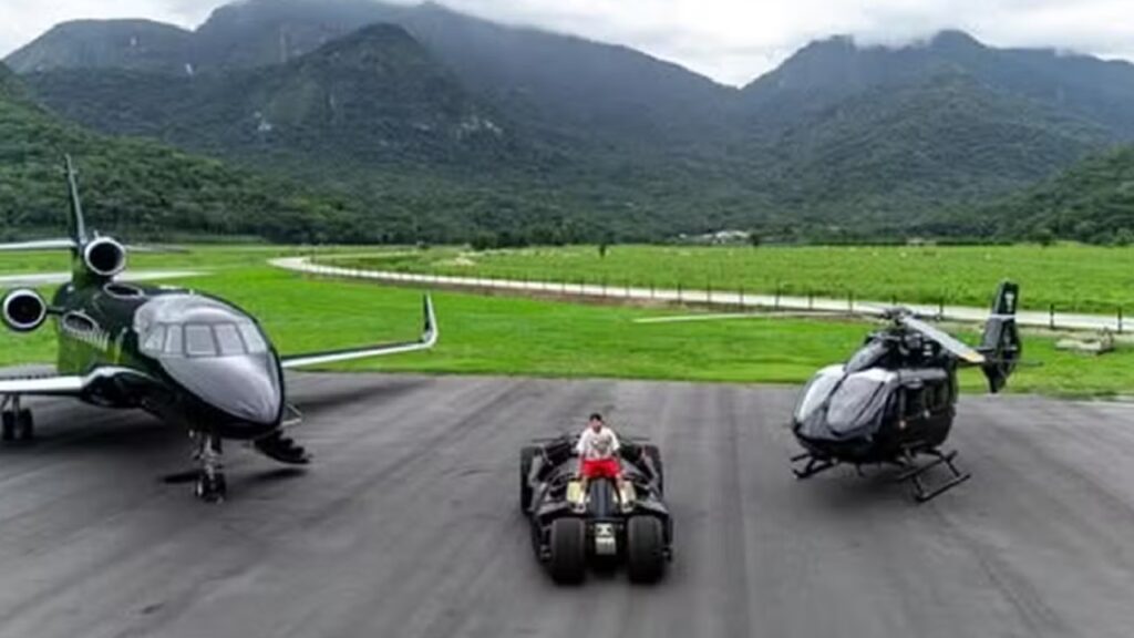 Neymar Jr. compartilhou nas redes sociais imagens da sua coleção de artigos de alto luxo armazenada na mansão em que vive em Mangaratiba, no interior do Rio de Janeiro. O jogador do Santos mostrou que, além do futebol, também cultiva o gosto por veículos exclusivos: ele possui uma réplica do carro usado por Batman em O Cavaleiro das Trevas (2008), um jato executivo Dassault e um helicóptero de alto padrão.