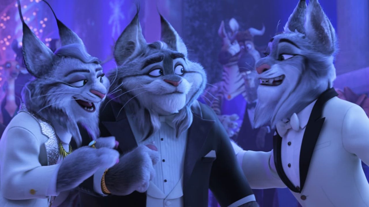 Três personagens animados com aparência de lobos vestem ternos e conversam sorrindo em festa elegante com iluminação roxa ao fundo