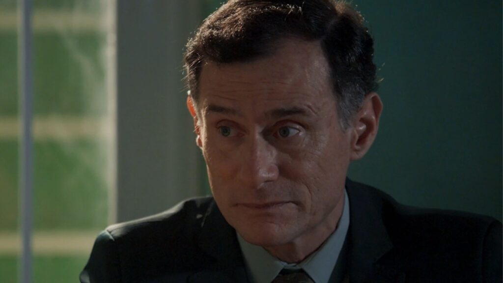 Homem de terno escuro olha para o lado com expressão séria em ambiente interno iluminado por luz natural
