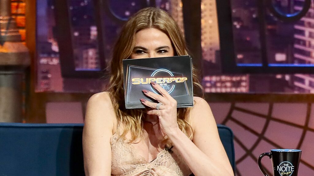 Luciana Gimenez, sentada no estúdio do SBT, sorri de forma divertida enquanto cobre parcialmente o rosto com um cartão que exibe o logotipo Superpop. À frente dela há uma caneca com a marca The Noite, símbolo da participação no talk show de Danilo Gentili