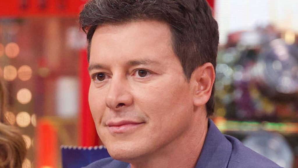 Apresentador Rodrigo Faro em close frontal com expressão serena veste blazer azul sob luz de estúdio televisivo com fundo levemente desfocado em vermelho