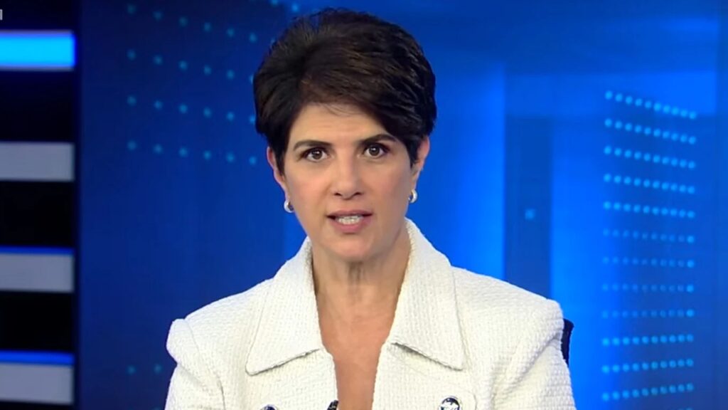 Apresentadora de telejornal com blazer branco fala em estúdio com fundo azul durante edição de noticiário ao vivo