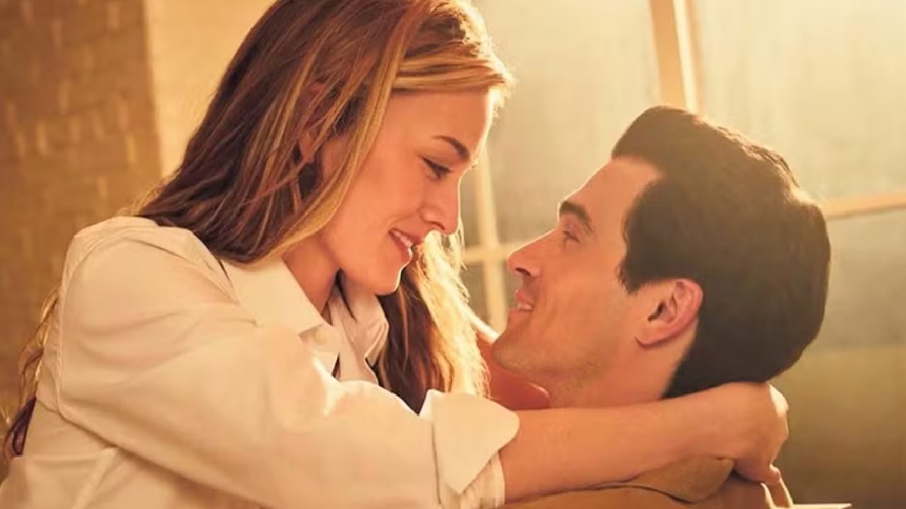Homem e mulher trocam olhares e sorrisos em um momento íntimo, iluminados por luz quente que entra pela janela ao fundo. Ela, com cabelos claros e camisa branca, envolve o pescoço dele com os braços, enquanto ele, sentado, olha para ela sorrindo. O cenário sugere ambiente interno acolhedor, com atmosfera romântica.