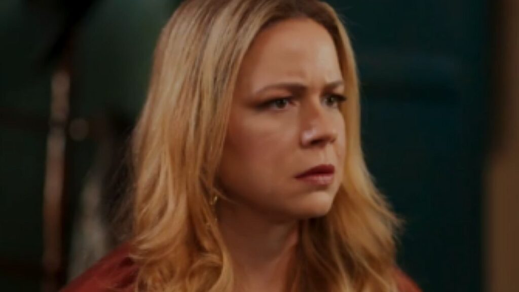 Mulher loira aparece em close, com expressão séria e olhar tenso voltado para algo fora de cena. O fundo escuro e desfocado sugere ambiente interno, indicando momento dramático em cena de novela ou série.