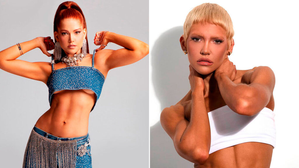Montagem de fotos mostra Letícia Augustin com cabelos ruivos longos e top jeans à esquerda, e com cabelos loiros curtíssimos e top branco à direita