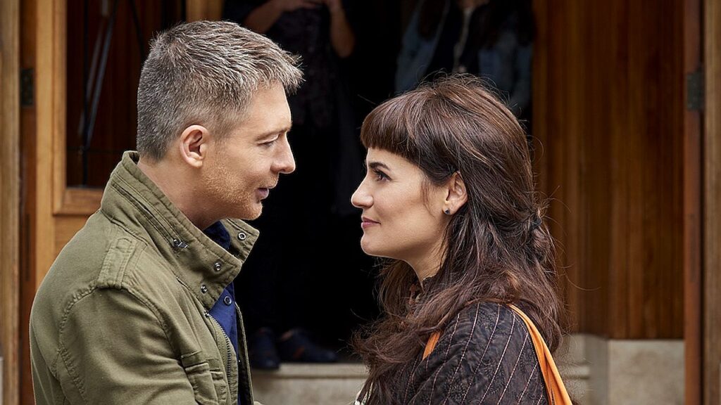 Homem e mulher se encaram próximos em cena romântica em frente a porta de madeira