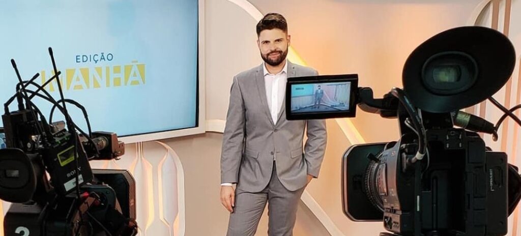 Gustavo Nolasco posa no estúdio do Edição Manhã, novo jornalístico da Rede Família (foto: Divulgação)