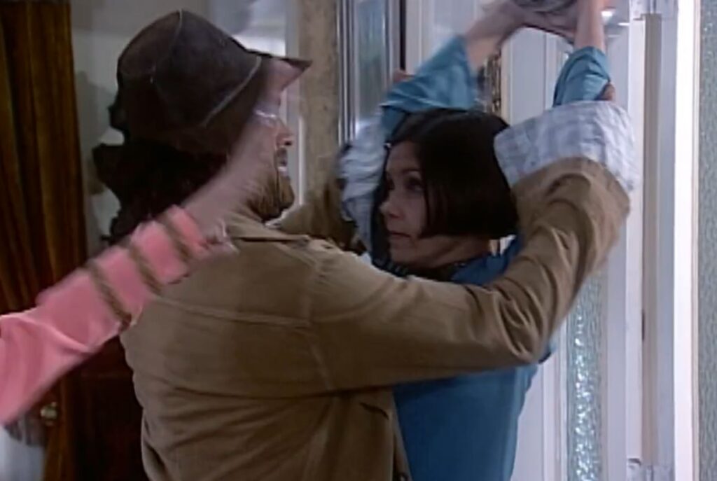 “Me larga, Petruchio! Me larga! Você irá me machucar”, afirmará ela entrando em pânico por estar grávida. “Você não se machuca e vai aprender a tratar o marido bem”, declarará ele. “Me larga, Petruchio! Você pode me fazer mal!”, gritará ela com medo de machucar o bebê. “Não vai fazer mal nenhum porque você vai assim e é assim que eu vou levar você”, sentenciará o homem carregando a mulher nas costas enquanto Dalva e Candoca se preocupam com a situação de Catarina.