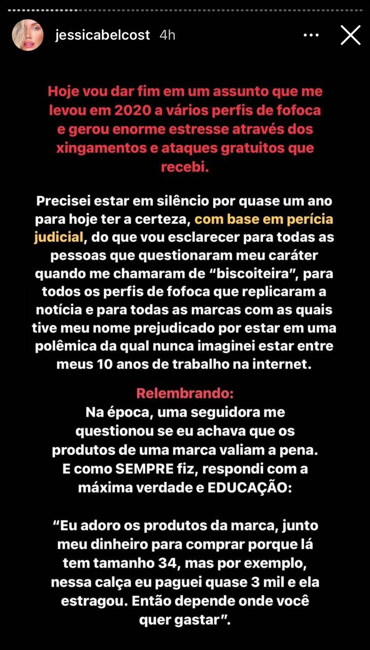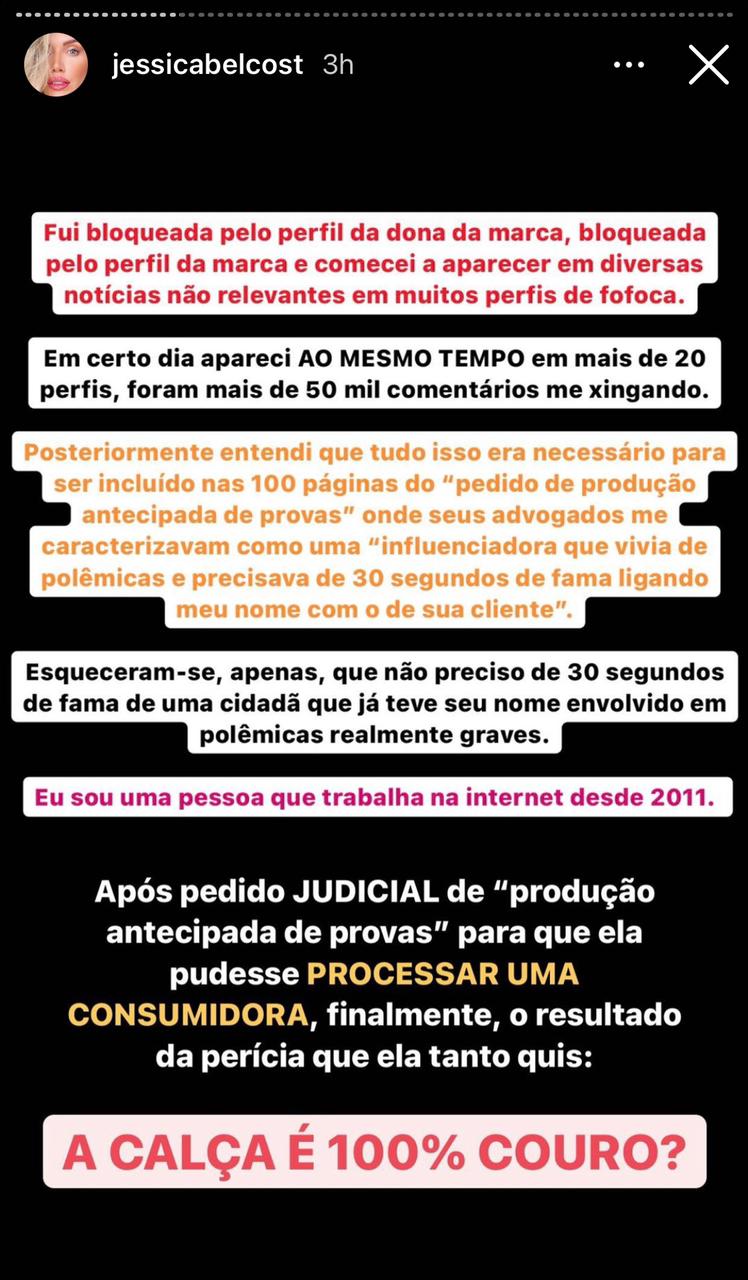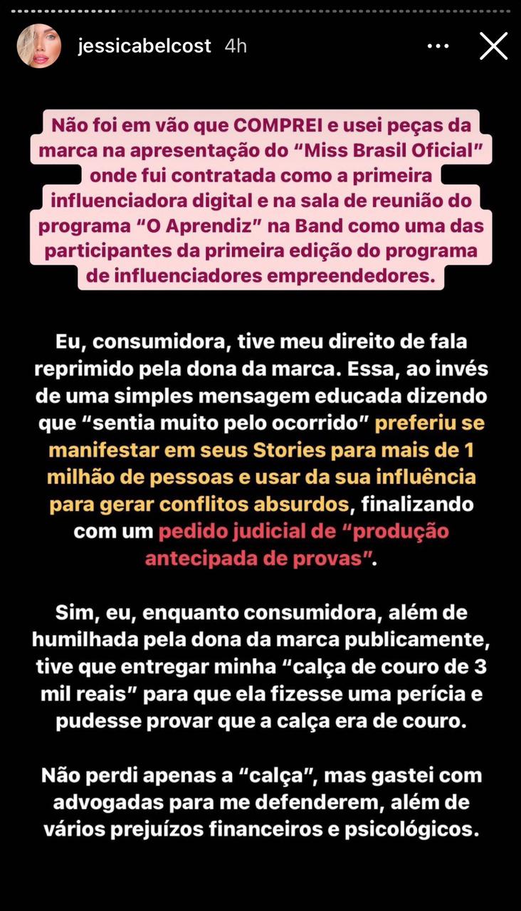 Jessica Belcost escreveu em suas redes sociais que teve o direito de fala reprimido pela dona da marca. “Essa ao invés de uma simples mensagem dizendo que sentia muito pelo ocorrido preferiu se manifestar em seus stories para mais de um milhão de pessoas e usar da sua influência para gerar conflitos absurdos, finalizando com um pedido judicial de produto antecipado de prova”, revelou.