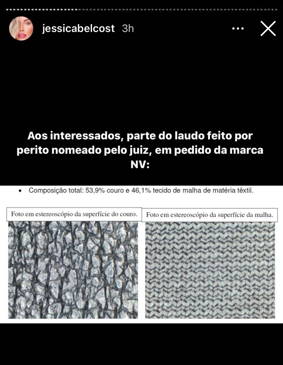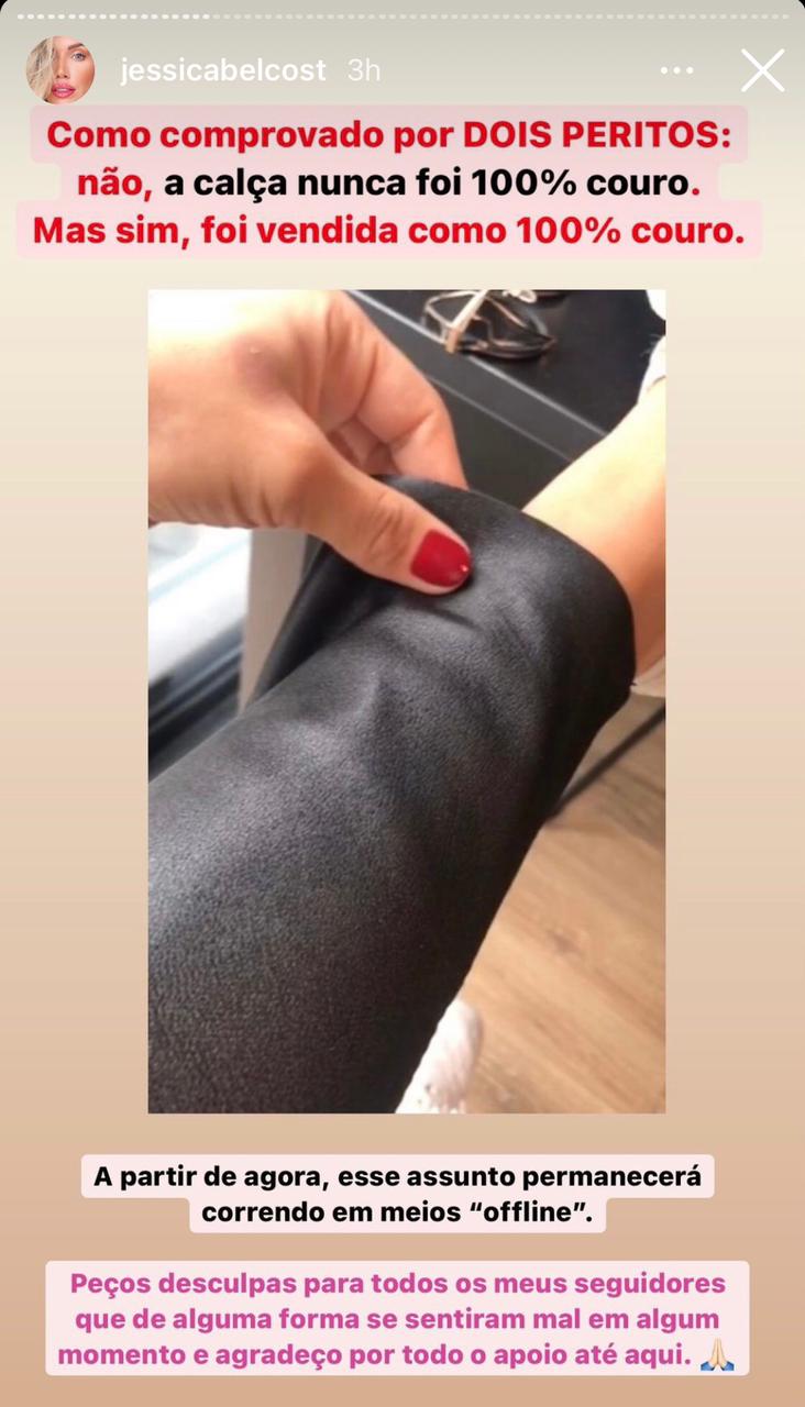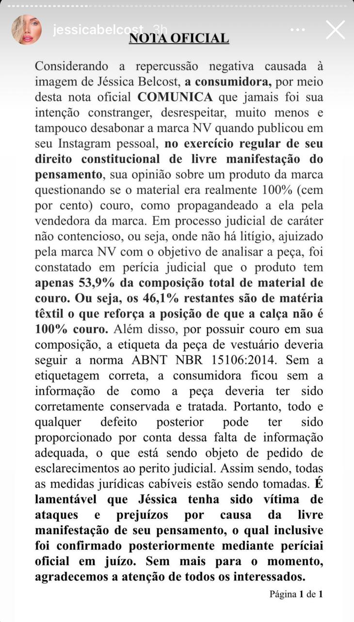 A nota oficial esclarece que a calça tem apenas 53,9% de composição total de couro. Ou seja, os 46,1% restantes são de matéria têxtil, o que reforça que a calça não era 100% couro. “Como comprovado por dois peritos, não, a calça nunca foi 100% couro, mas sim foi vendida como 100% couro”, pontuou Jessica Belcost.
