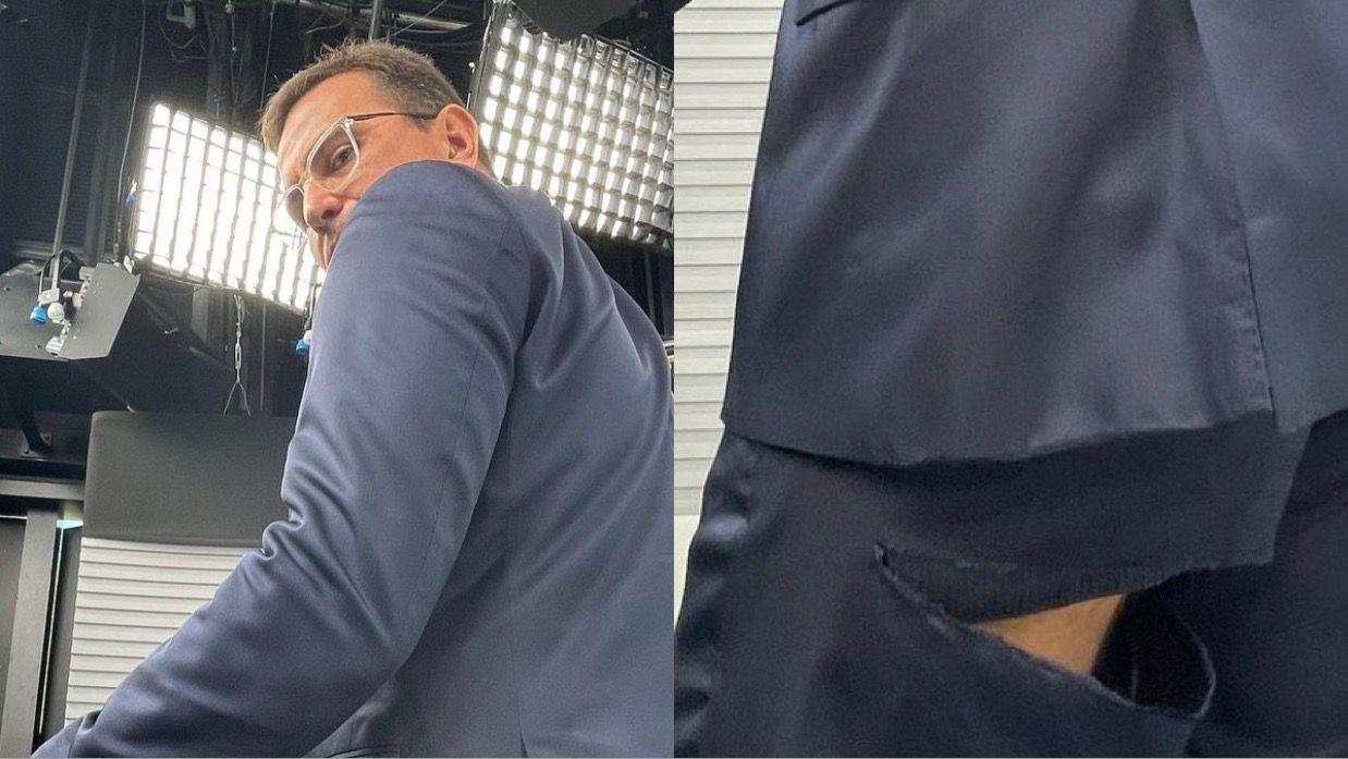 Além da experiência de ter tido que pular da varanda de casa para ir trabalhar na segunda (6), ele compartilhou com os seguidores um detalhe curioso sobre o figurino da Globo: a calça do terno testava rasgada.